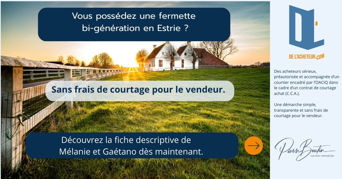 Jeunes acheteur(euse)s dans la vingtaine, disposant d’un budget de 445 000 $. Leur projet immobilier vise une propriété en Estrie offrant au minimum deux chambres et deux salles de bain, avec en priorité un garage et/ou une écurie fonctionnelle.