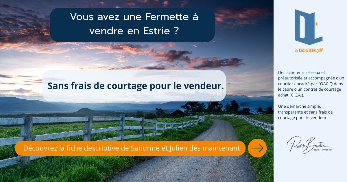Jeunes acheteur(euse)s dans la vingtaine, disposant d’un budget de 445 000 $. Leur projet immobilier vise une propriété en Estrie offrant au minimum deux chambres et deux salles de bain, avec en priorité un garage et/ou une écurie fonctionnelle.